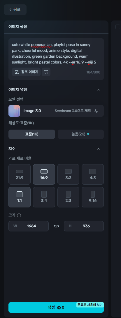 2. 생성한 프롬프트를 입력창에 넣고 원하는 설정을 한 후 [생성]을 클릭한다.