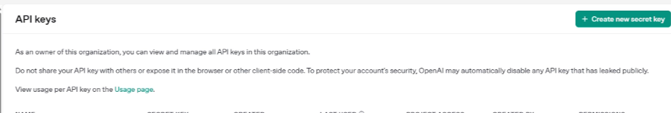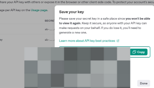 9. 그러면 다음과 같이 Secret key가 생성된다. Openai API key는 단 한번만 보여지니 꼭 메모장에 저장해야 한다.