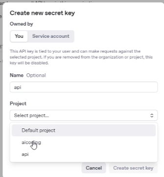8. key 이름을 입력하고, 아까 생성한 Project 를 클릭 후, [Create secret key]를 클릭한다.