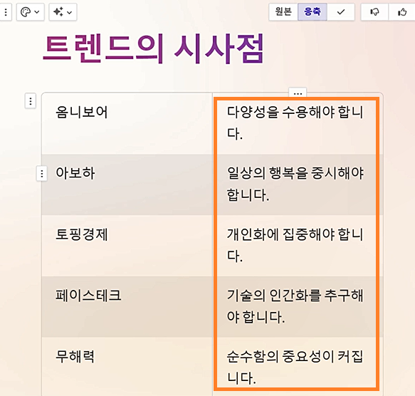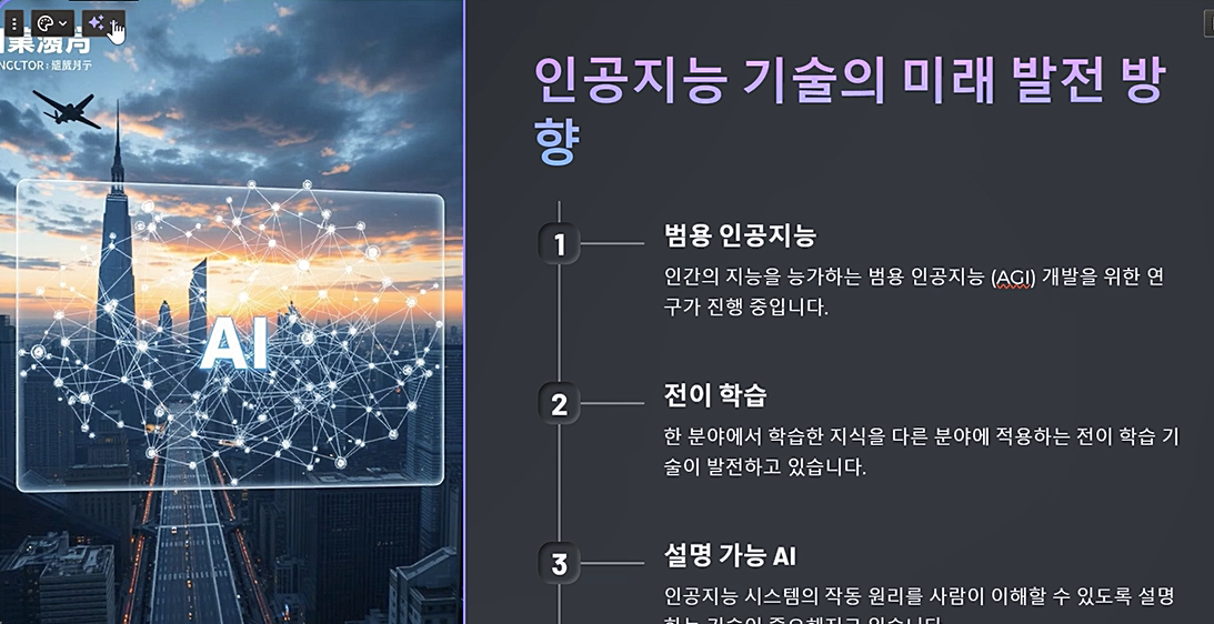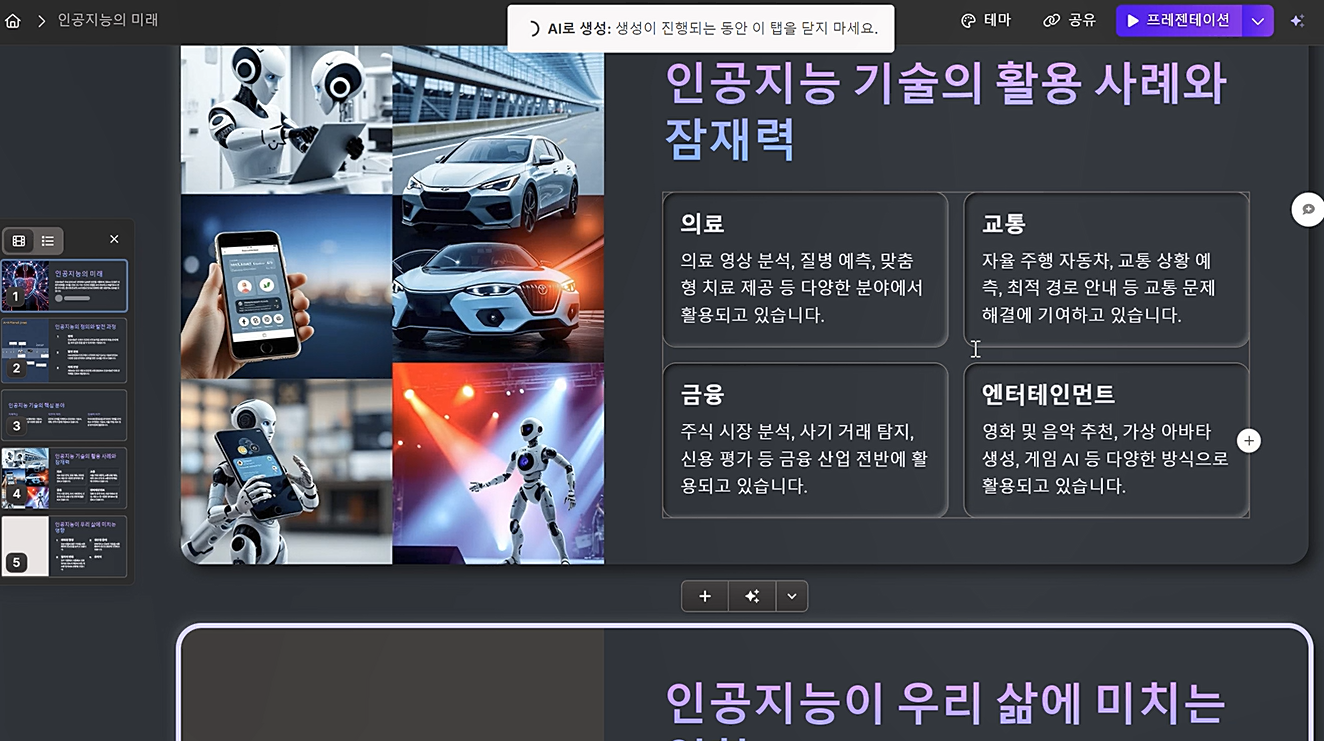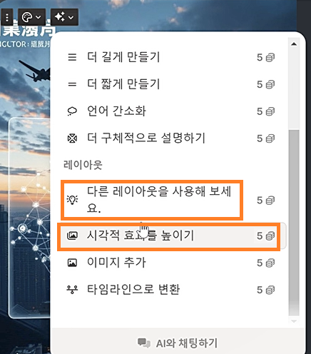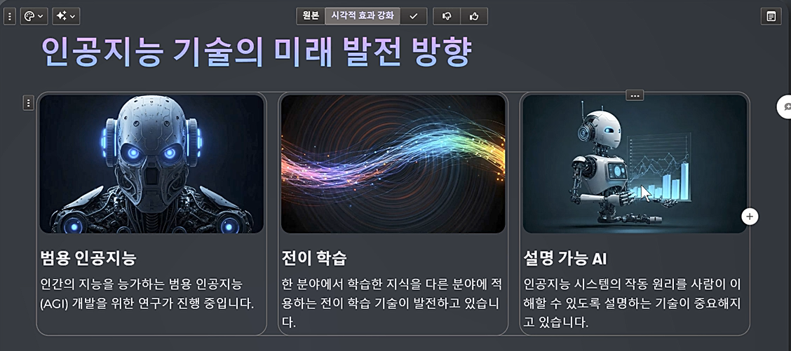 생성된 PPT의 레이아웃을 변경할 수 있다. [시각적 효과를 높이기]를 선택하면 다음과 같이 ai가 알아서 시각적 효과를 높인 PPT로 만들어준다. 내가 직접 레이아웃을 선택하려면 [다른 레이아웃을 사용해 보세요]를 클릭하면 된다.