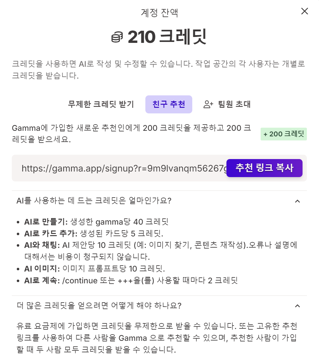 400 크레딧 소진 후 더 무료로 사용하길 원한다면, [친구 추천] 클릭해서 추천 링크 복사 후 친구에게 공유한다. 친구가 해당 링크로 Gamma에 가입하면 친구는 처음부터 600 크레딧(기본 무료 400크레딧 + 200크레딧)을, 본인은 200 크레딧을 받을 수 있다. (자신의 추천 링크 복사를 통해 친구들이 가입한다면
