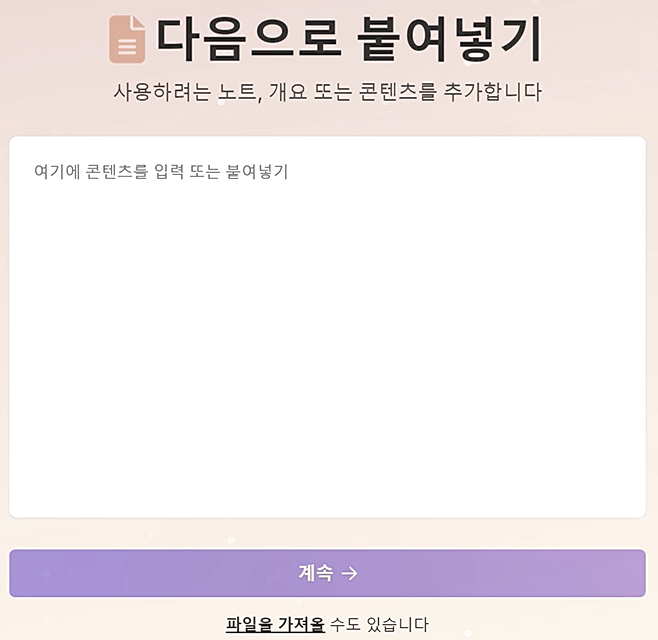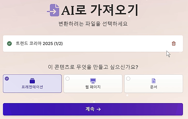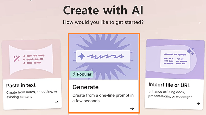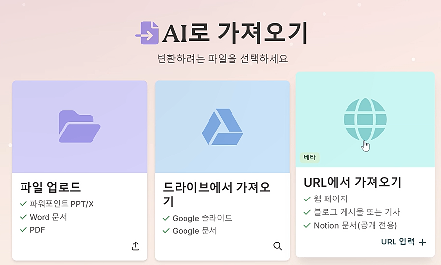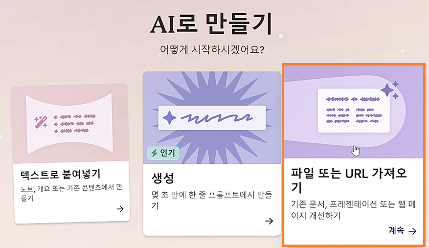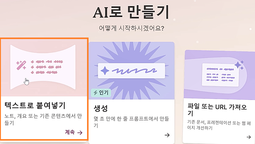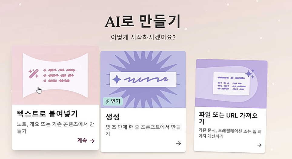 [텍스트를 붙여넣기]나 [파일 또는 URL 가져오기]를 클릭해 기존 콘텐츠에서 만들거나, [생성]을 클릭해 PPT 컨텐츠를 ai로 생성할 수 있다.