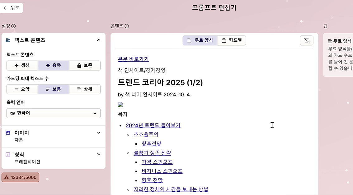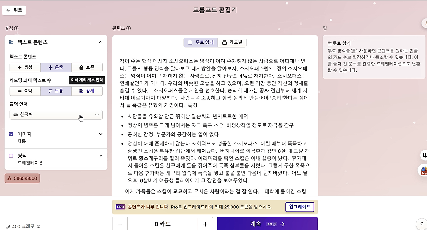 2. 좌측에서 텍스트 콘텐츠 설정을 하고, 이미지와 형식을 선택한다. 하단에 생성할 카드 (슬라이드) 수를 선택한다.