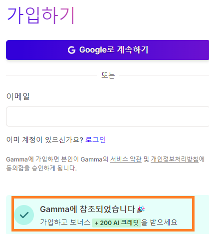 2. 위 링크로 가입 시 '가입하고 보너스 +200 AI 크레딧을 받으세요'라는 메시지가 보인다.