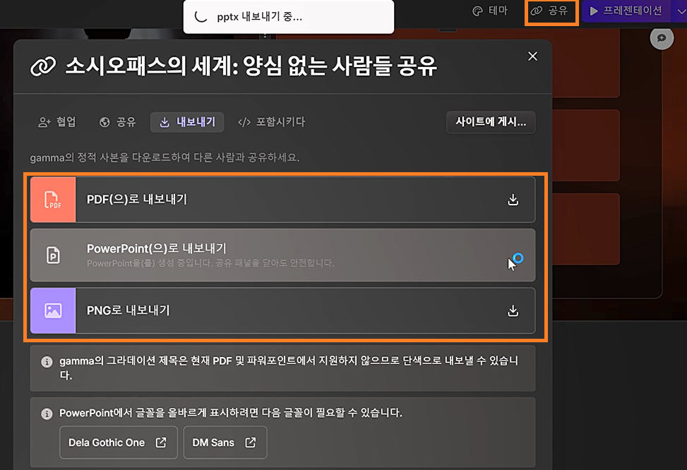 5. 생성된 PPT를 내보내려면 우측 상단에서 [공유]를 클릭한 후 파일 형식을 선택 한다.