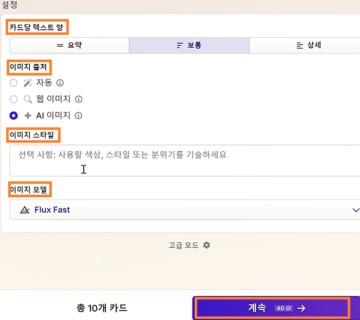 3. 카드당 텍스트 양, 이미지 출처, 스타일, 모델을 선택한 후 [계속]을 클릭한다.