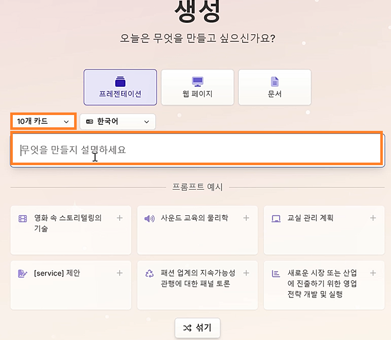 1. 생성할 PPT 의 카드 수를 선택한 후 입력칸에 PPT 주제를 입력한다.