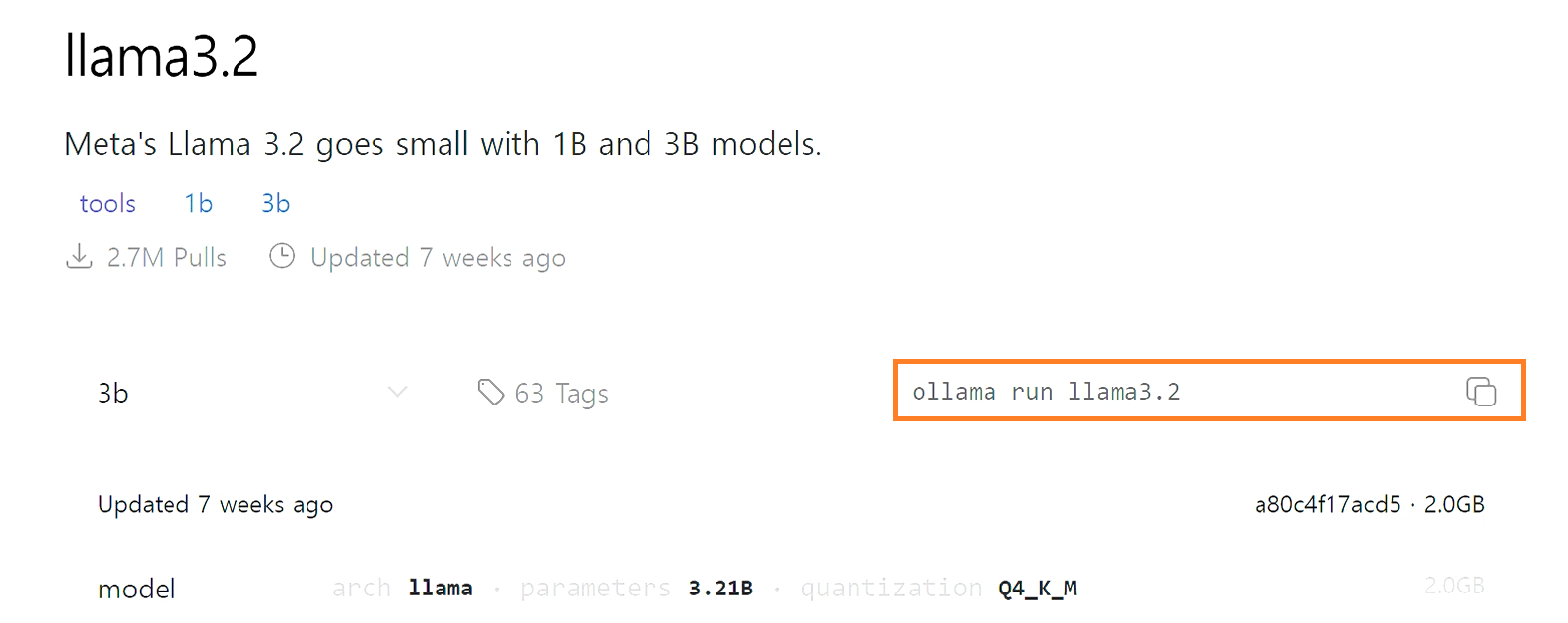 4. 최신 모델인 "llama3.2"를 클릭하면, 터미널에서 실행시킬 수 있는 명령어를 복사할 수 있다.