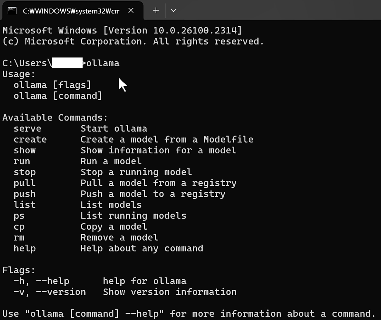 2. ollama를 입력하면 아래와 같이 올라마가 설치되었음을 보여준다.